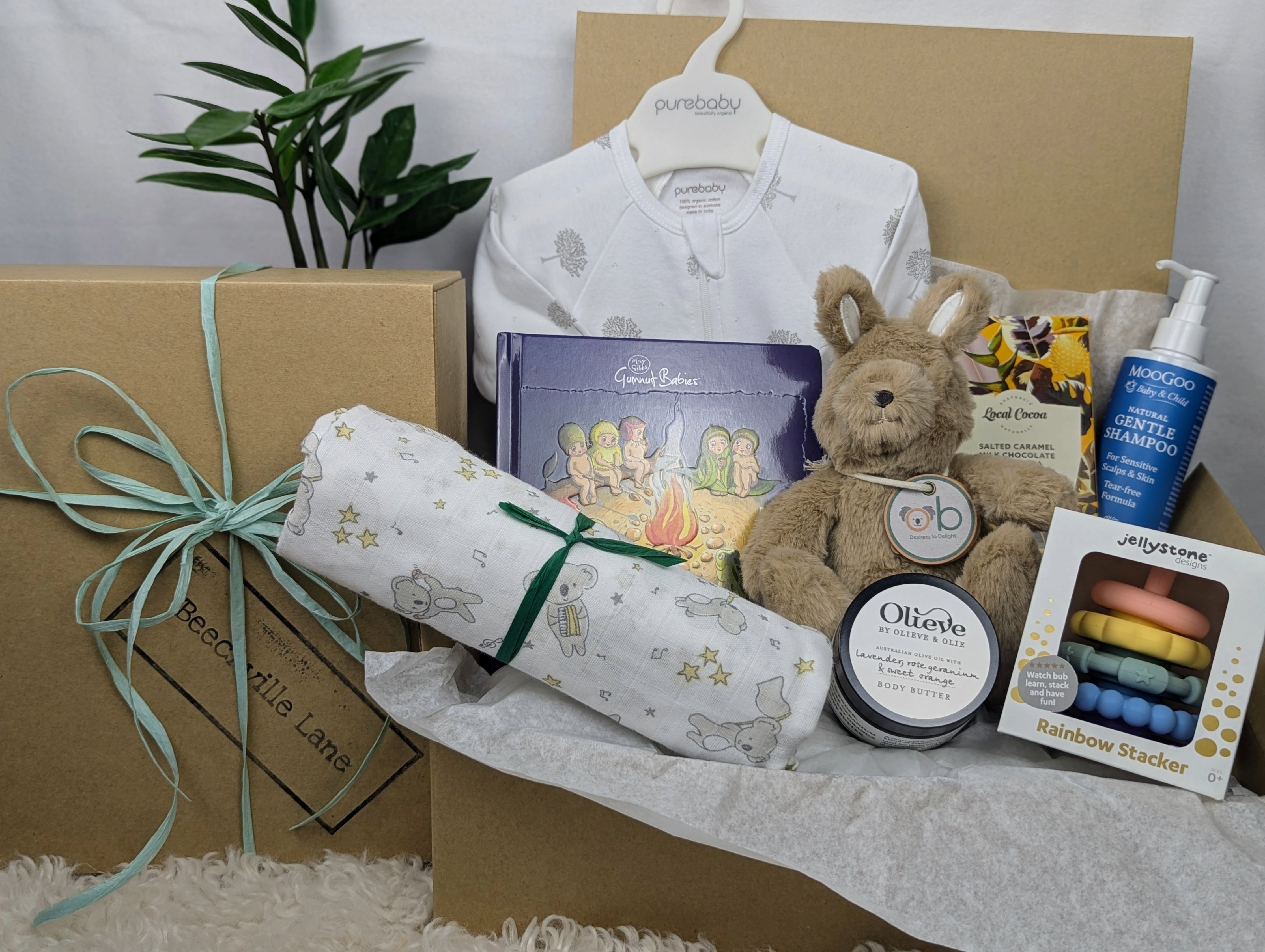 The Beaut (beautiful) Aussie New Mummy Box includes gifts for baby and special treats for mum or new parents. This unisex baby hamper features quality Australian iconic brands that are staples in households across the country.