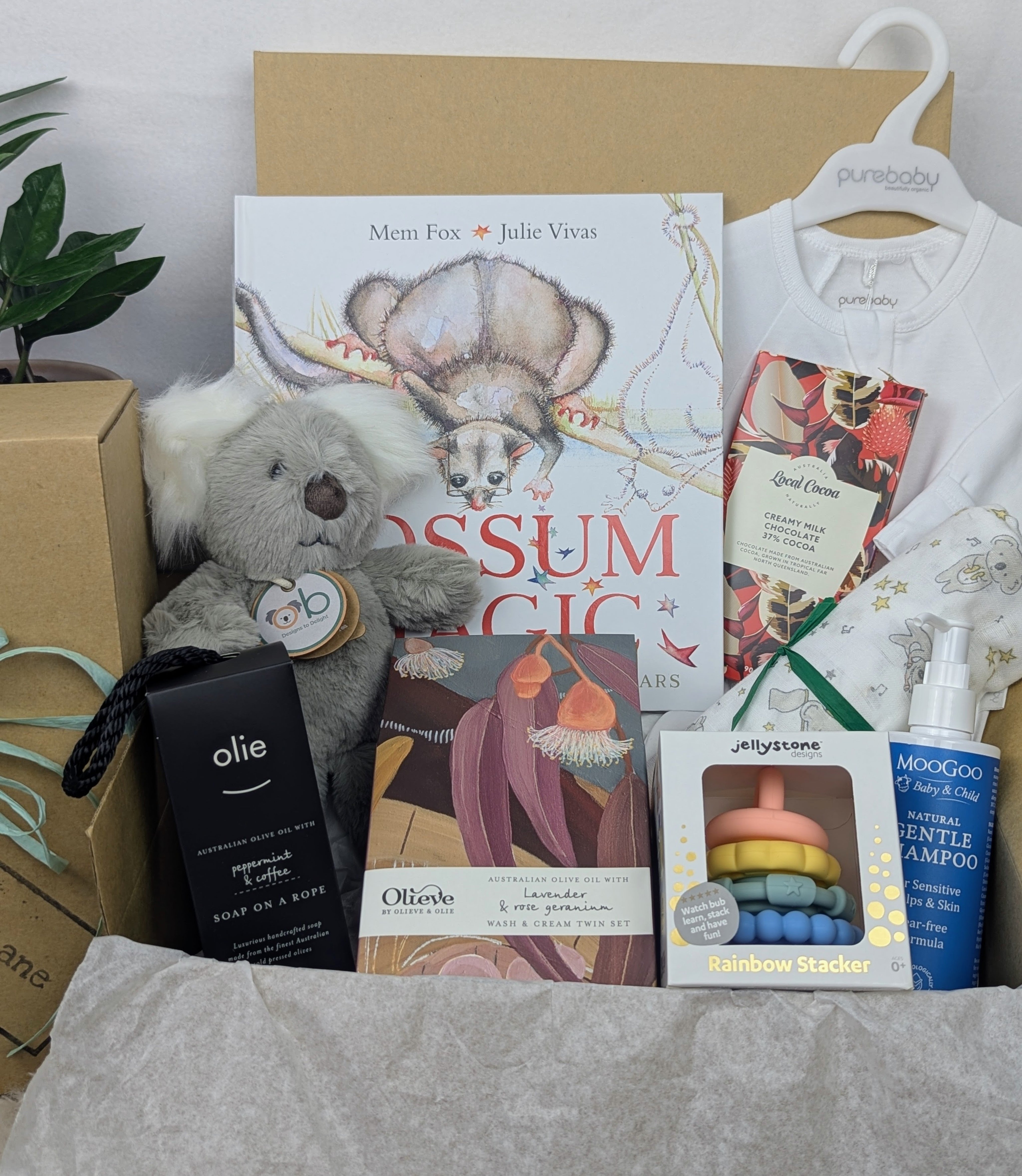The Bonzer Aussie New Mummy Box really has it all and includes gifts for baby and special treats for mum and new parents. This beautiful hamper features Australian iconic brands MooGoo, Purebaby, Local Cocoa, Jellystone Designs, Olieve & Olie and classic children's book Possum Magic. All items are beautifully presented in a tissue-lined box with a mint raffia ribbon.