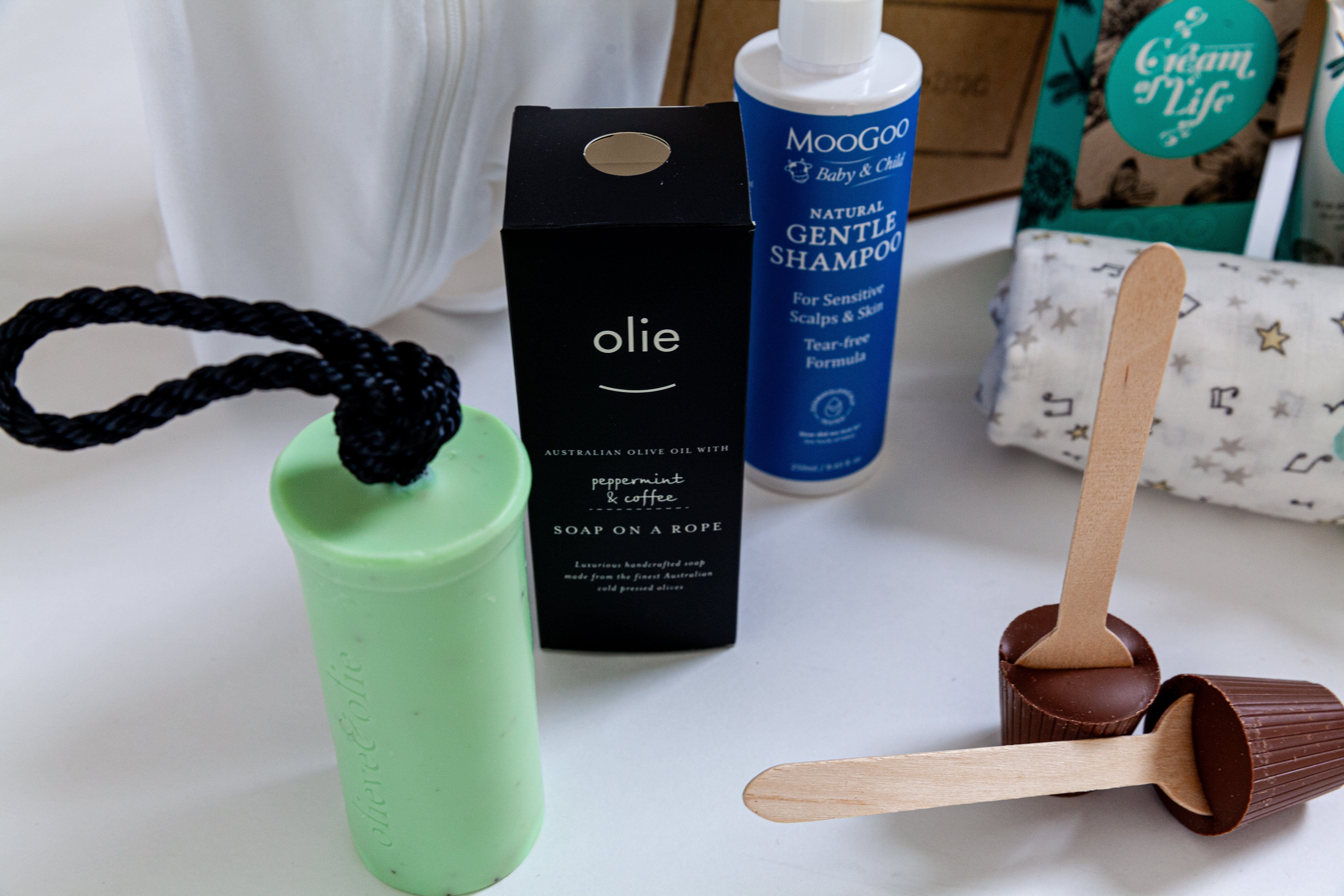 This beautiful new baby and parent hamper features Australian iconic brands MooGoo, Purebaby, OB Designs, Little Linen Co., Jellystone Designs, Belgian Delights and Oieve & Olie. All items are beautifully presented in a tissue-lined, recycled kraft box with a mint raffia ribbon.