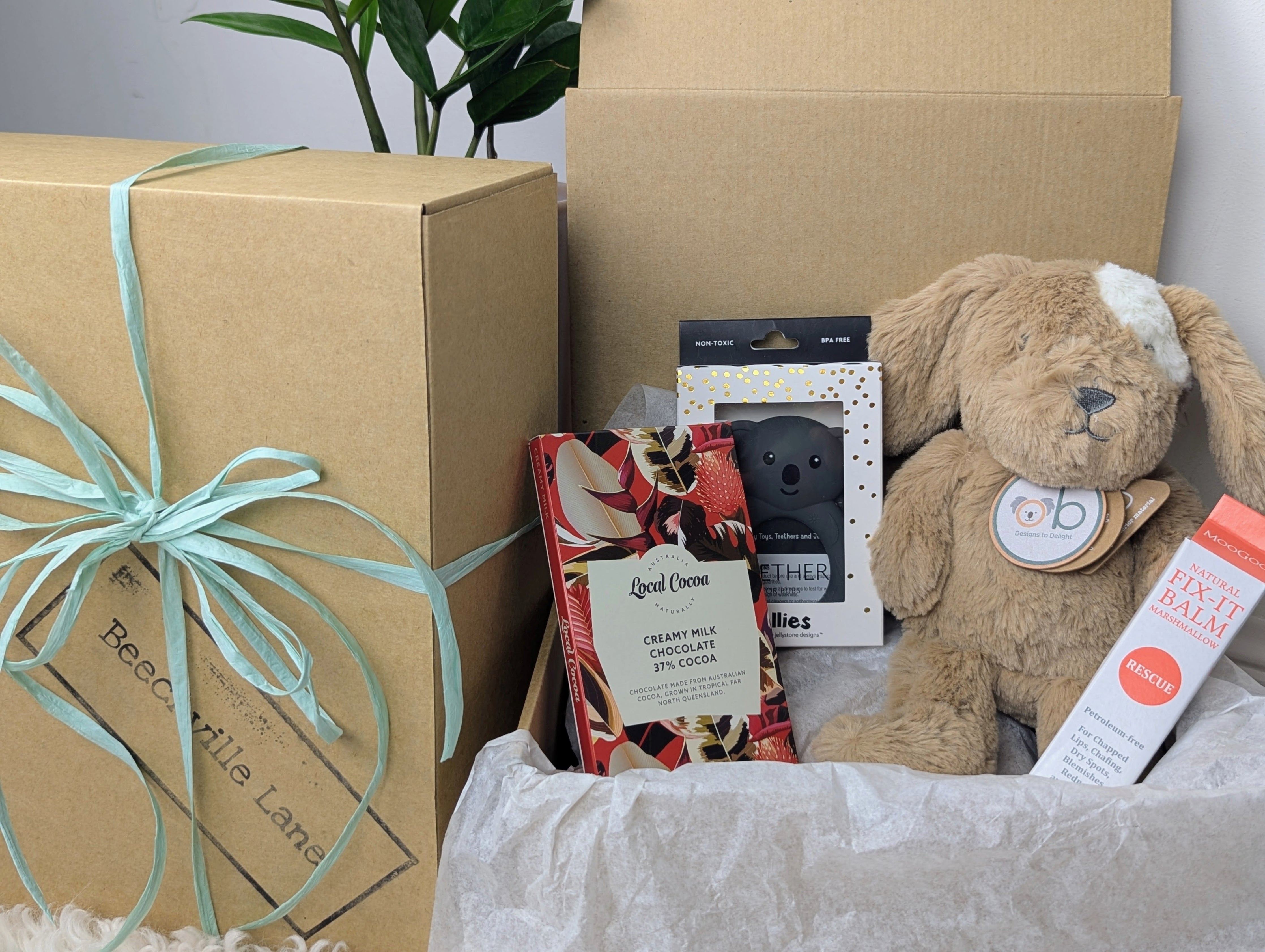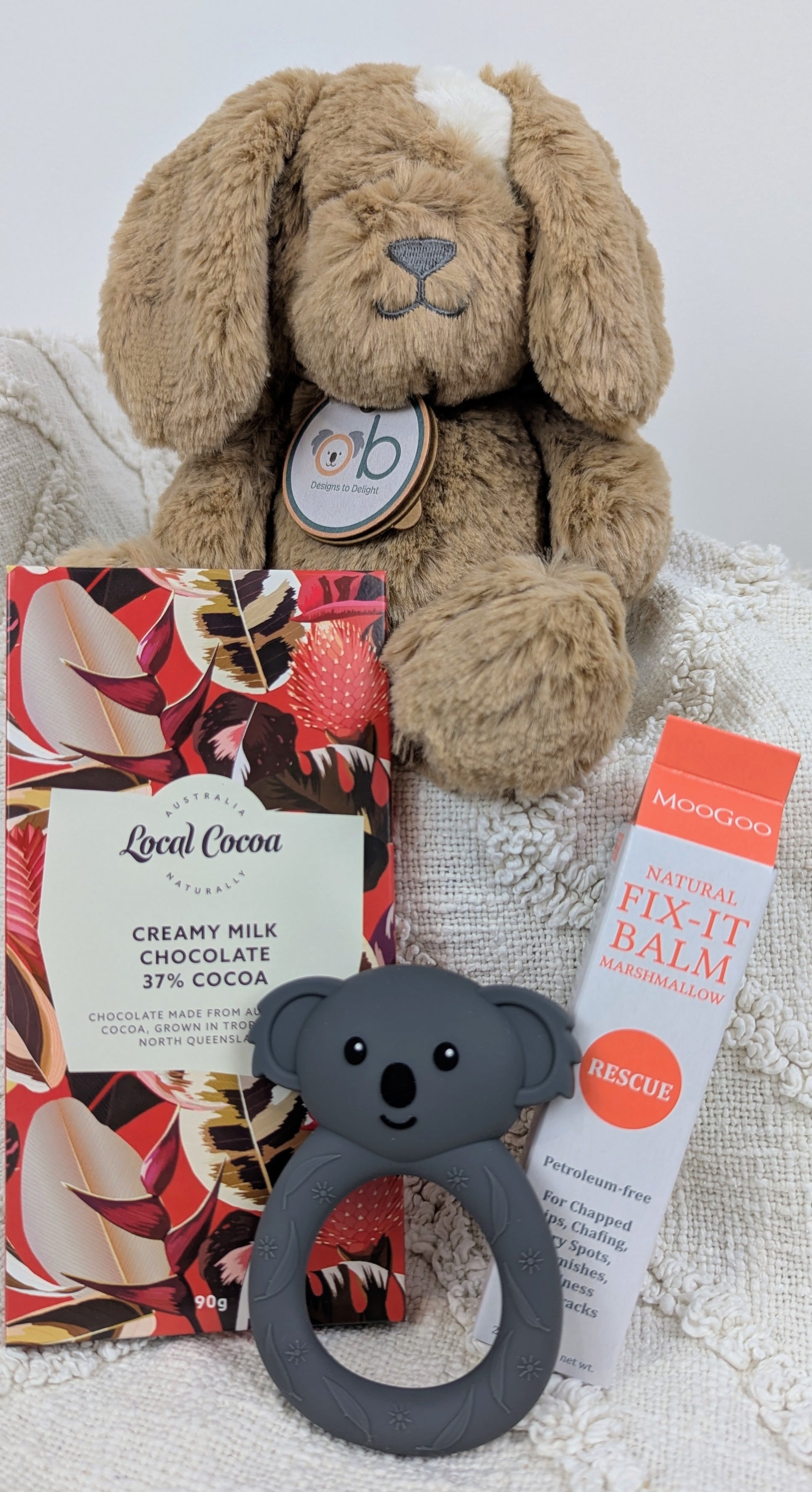 Lil’ Puppy Cuddles New Baby and Parent Box is a little pocket rocket way to send your best wishes. With a perfect compact combination of OB Designs super soft Little Duke Dog, a Jellystone Designs Koala Teether, MooGoo Marshmallow Rescue Fix-It Balm and delicious Local Cocoa Creamy Milk Chocolate 90g bar, it’s sure to be a hit.