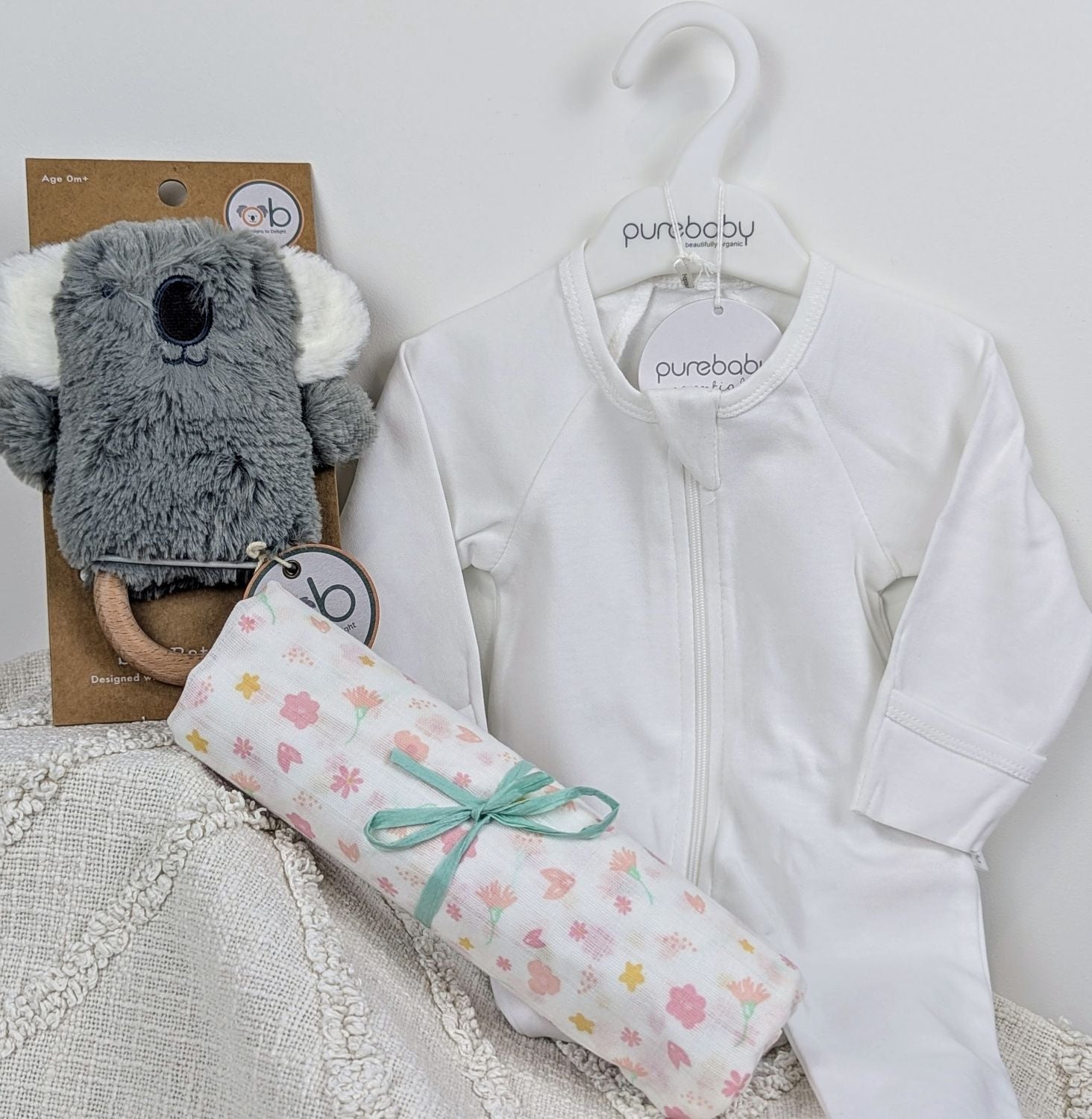 The Lil’ Kelly New Mummy Box is a perfect thoughtful, effortless new baby gift. This beautiful hamper features Australian iconic brands Purebaby, The Little Linen Company and OB Designs. All items are beautifully presented in a tissue-lined box with a mint raffia ribbon.